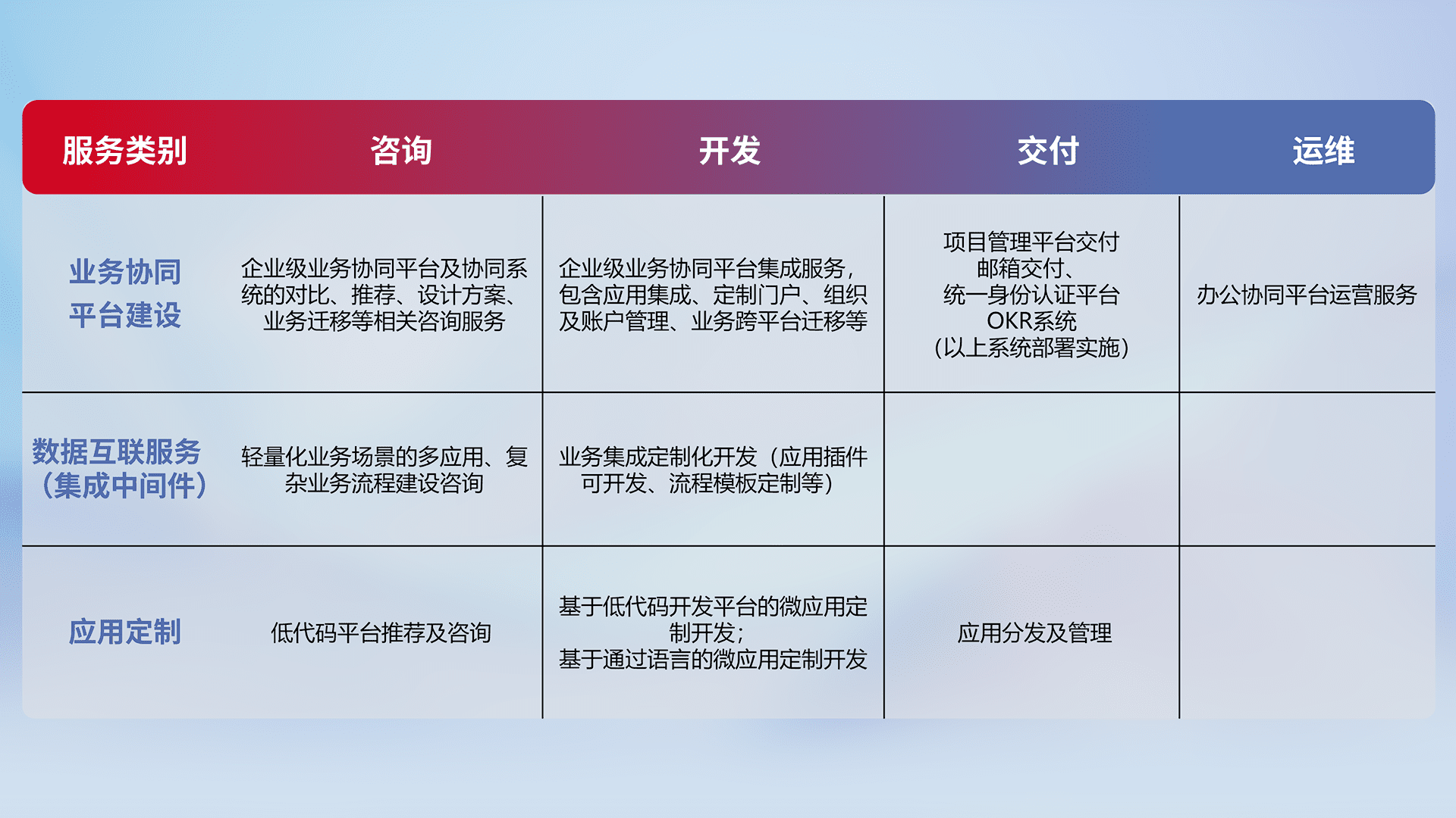 针对钉钉、、企微、、IDaas等平台级产品提供产品的规划、、、方案、、、交付、、、、定制化开发等服务,,,实现如统一协同办公、、智能客户服务、、、混合会议管理、、智能数据查询、、等业务场景,,实现数字化转型。。。